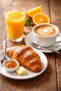 Un café o infusión, una pieza dulce o salada y una pieza de fruta o zumo. Si estás interesado inclúyelo al hacer tu reserva.